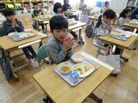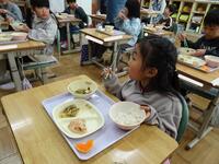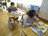 1年生の給食の様子です。おいしそうにもりもり食べていました。