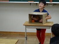 「はこのかたち」の学習をしていました。手探りでさわった感覚だけでどんな形なのか、どの仲間と一緒か考えます。当たると拍手が起こっていました。