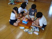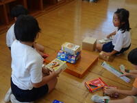 自分たちが用意した箱を使って、どれだけ高く積み上げることができるか挑戦しています。「大きい箱を先にしよう」と、大きさに注目して積み上げている様子が見られました。