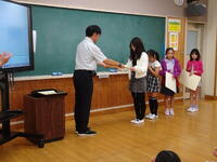 表彰では、「社会を明るくする運動ポスター」と「三島せせらぎミニミニ水力発電コンテスト」で賞をもらった児童に賞状を渡しました。