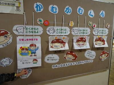 給食の掲示は、咀嚼についてです。「よくかむとこうなるよ!」と絵を引っ張ると解説が出てきます。