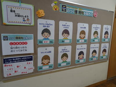 保健の掲示は、10月10日の「目の愛護デー」にちなんで、目の付く慣用句作りができるようになっています。
