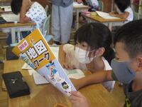 地図を指さしたり、全体を眺めたりしながら、静岡県の工業について興味深く学んでいました。複数の資料を活用しながら、学びを深めていきます。