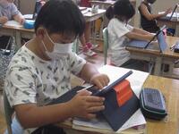 体育の授業で使う、ラケットを作っているとのこと。タブレット端末を使い、どんなデザインにしようかなと思案している子、自分の好きなキャラクターを描き始める子、オリジナルの絵を描き始める子と、さまざまです。