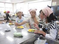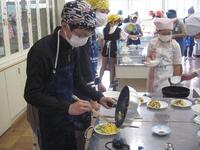 完成した班から、野菜炒めとスクランブルエッグをいただきます。