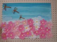 校舎内廊下には、紙で作られたコスモスやとんぼが飾られています。