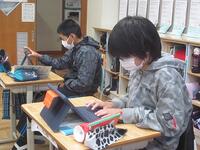 テストを終えた子どもたちは、タブレット端末を使い文字入力の練習や読書をしていました。