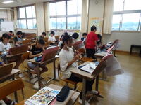 思い出の風景がいよいよ完成です。作品カードを仕上げた子は、夏休みの課題のポスターに向けて構図を考えたり、下書きをしたりしていました。