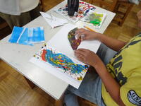 3年生の図工です。先週スパッタリングやローラーで色を付けた紙を思い思いの形に切り出し、貼り付けています。