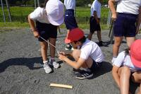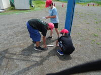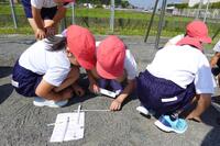 校庭に降った雨水がどこにたまるか予想をして調べました。