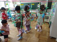 七夕飾りを折り紙でつくり、飾っています。これからお願いを書くようです。