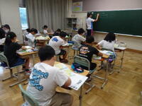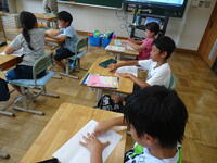 思い出の風景がいよいよ完成です。作品カードを仕上げた子は、夏休みの課題のポスターに向けて構図を考えたり、下書きをしたりしていました。