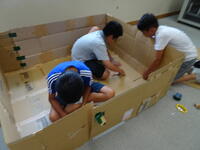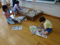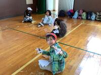 新聞紙を使って、折ったり、丸めたりしながら造形を楽しんでいきます。