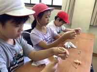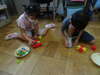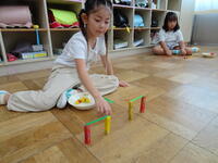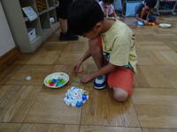ペットボトルの蓋を並べたり、積み木を積み上げたり、棒をつないでみたりと楽しみながら取り組んでいました。