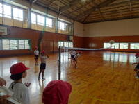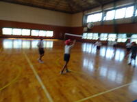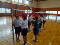 ソフトバレーボールを使った、ネット型ゲームを行っていました。キャッチしたボールを仲間にパスをして、相手のコートに返します。