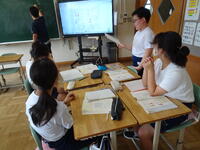 三角形の内角の和は180度というきまりを使って、三角形の内角や外角の角度を計算で求めていました。お互いに教えあいながら問題に取り組んでいました。