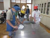 調理に使用するざるや菜箸などは、既に準備が整っています。エプロンを着けて、手をよく洗って、さあ、実習に入りましょう。