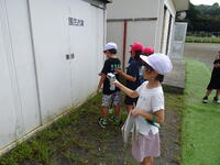 鏡を使って日光を反射させます。友達と協力して反射させた光を集めると温度が上がるかどうか調べます。