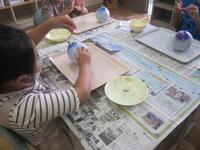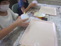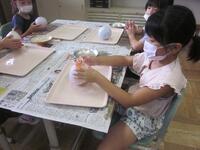 ふくらませた水風船に、紙をぺたぺたと貼っていきます。1年生のみんなは、丁寧に紙を貼っていました。