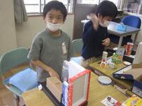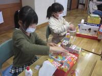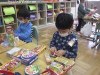 各家庭から保ってきたお菓子などの箱を使って、動物や家、乗り物をつくりました。