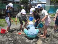 今日は、一人ずつバケツを用意し、稲を植えていきました。これから秋まで、育ち方を観察しながら、育てていきます。どんな風に生長していくのか、楽しみですね。