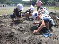穴をほってトンネルをつくったり、バケツをつかって砂を固めたりしました。