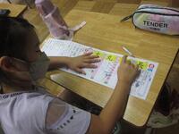 漢字ドリルに書かれているお手本の字を指でなぞったり、目をつぶって空書きをしたりしながら、筆順を確認していきます。画数が多い漢字も増えてきましたが、一生懸命覚えています。