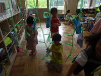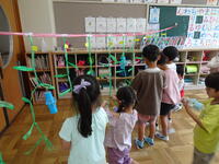 七夕飾りを折り紙でつくり、飾っています。これからお願いを書くようです。