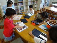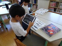 魚釣りを企画していました。釣りたい魚を図書室で調べて写真に収めました。写真を見ながら魚を描いていきます。