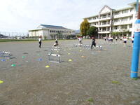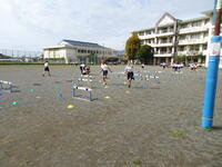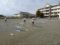 ハードル走を行っています。歩幅とスピードに合わせて、ハードルのインターバルを選んで記録を測ります。