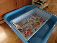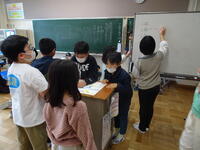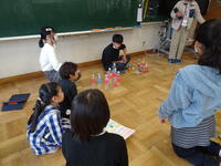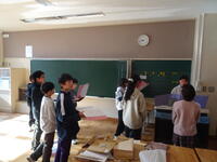 鉛筆を直接並べて比べたり、紙テープを調べる物に当てて測り比べたりしてきた1年生が、離れたものを比べる方法を考えています。前回は、基準となるブロックを使いましたが、今回は、1㎠マスを使って比べられることに気付きました。直接比較から間接比較に変化させていきます。