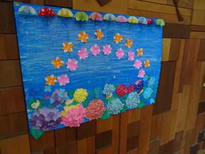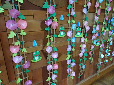 校内もアジサイが咲き、たくさんのカエルが鳴いております。昇降口前の掲示もこの時期に合わせたものになっています。