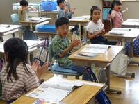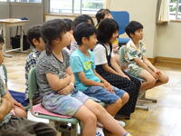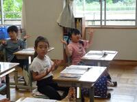 先生が手本の拍を手でたたき、それをまねしていました。上手に拍が取れていました。