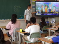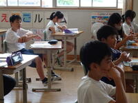 チャンツで流れる英文について、どのような意味なのか、また、どのように発音するのかを確認していました。