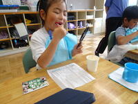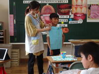 歯の役割や虫歯になる仕組み、歯みがきの大切さを学習した後、実際に歯を着色して歯みがきレッスンに入りました。