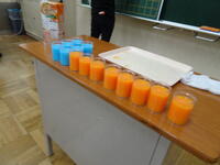 「かさ」の学習です。青い色の水とオレンジ色の水のかさを比べます。どのように比べると良いか意見を出し合っていました。