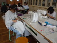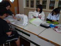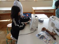 ナップサックが完成に近づいてきました。縫い終わった子は、肩紐になる部分を通していたり、友達にミシンの使い方を教えたりしていました。