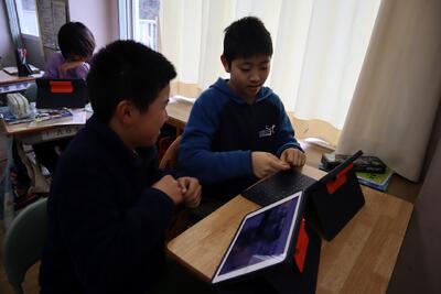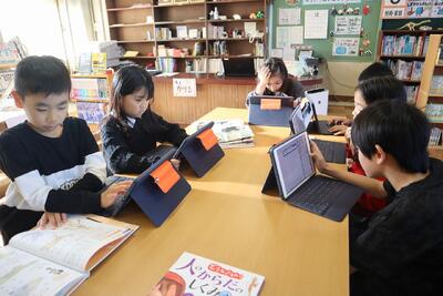 4年生の理科の授業では、子供たちが、教室や図書室で様々な方法をつかって、調べ学習を進めています。動物の骨について、自分の興味関心に合わせて、活動を進めていきます。