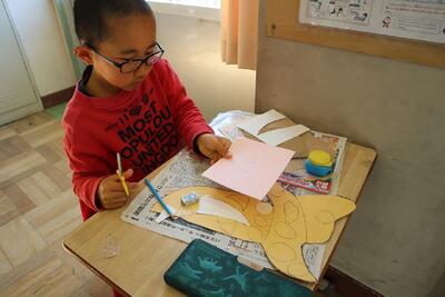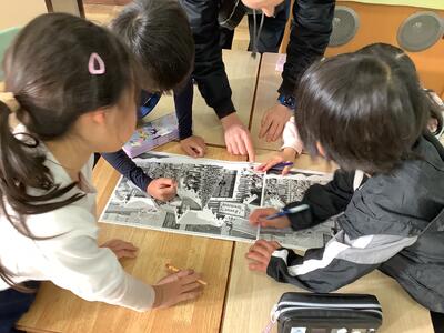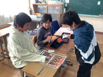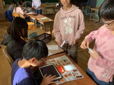 5年生の図工の授業では、「光を活かし、ぼく・わたしだけのひみつの世界を表現しよう」の学習課題で、活動をしています。今日の授業では、子供たちが穴の開け方が異なる箱とアルミホイルや色セロファン、綿などの素材を組み合わせることで、差し込む光を感じながら、見える様子を豊かな表現で、友達に伝えたり、ワークシートに書き込むことができました。活動での気付きをもとにしながら、作品作りのイメージを広げていきました。