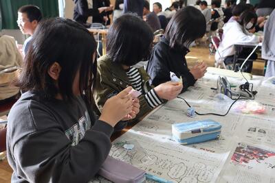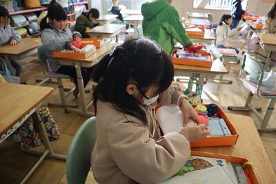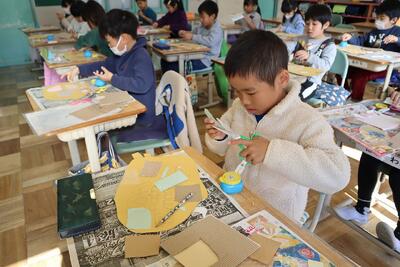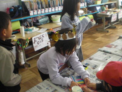 1年生の図工の授業では、ひなかざりを子供たちが夢中でつくっていました。かわいいひなかざりができあがりました。