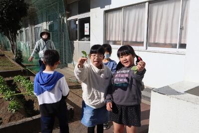 2年生は、生活科の授業で、野菜を育てています。ハツカダイコンの種を蒔き、芽が出てきました。今日は、ハツカダイコンが元気に育つために、間引きをしました。