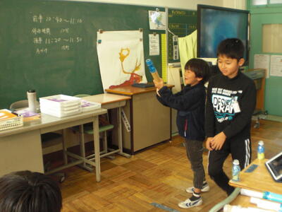 4年生の総合的な学習の時間では、子供たちが自分の課題について追究し、プレゼンテーションをつかって、発表をしています。クイズ形式も取り入れながら伝え合う活動も、楽しみながら学習をすることができます。