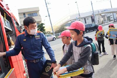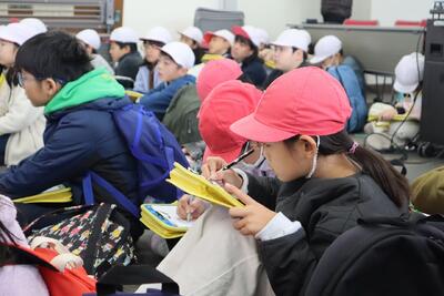 3年生が、社会科の学習で消防署を見学しました。富士山南東消防本部の職員の方に、消防署の役割や災害の実態など、詳しく説明していただき、子供たちの熱心に見学することができました。今回の見学では、バスや電車を使って移動し、楽寿園でのお弁当の時間も楽しむことができました。