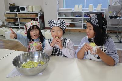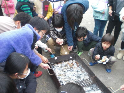 1年生が、さつまいものおいしいおやつ作りにチャレンジです。友達といっしょに蒸かしたおいもをつぶしていきました。ラップにくるんで上手におやつの完成です。