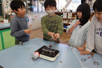 4年生の理科の授業では、ものの体積と温度について、子供たちが学習活動を進めています。今日は金属を温めたり冷やしたりしたときに、体積がどのように変化するのか、活動していきました。実験を通して、気付きが生まれ、学びの深まりを感じることができました。目を輝かせて実験を行い、気付いたことを自分の言葉でまっすぐに表現したり、タブレット端末のワークシートにしっかりとまとめられたり、意欲満々、興味関心をもって活動できる4年生です。