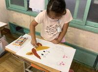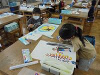図工の「楽しかったよどきどきしたよ」の学習で、2組も色塗りに入りました。背景の色や塗り方を自分で考えながら、集中して取り組んでいました。