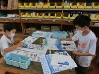 図工の「たのしかったよドキドキしたよ」の学習で、夏休みの思い出の絵を描いています。背景を絵の具で塗るときに、スースーと筆を動かす向きをそろえて塗ったり、筆をスタンプのように使ってポンポンと跡をつけて塗ったりと、それぞれ自分のイメージに合う塗り方を選んでいました。