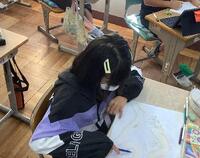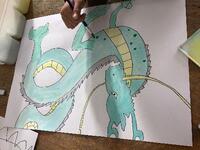 4年生の図工では、「ちび竜」というお話を読み、お話の世界を想像して竜の絵を描いています。竜の身体を巻いたりくねくねさせたりして長く立派な様子を表現しています。下塗りが終わった子は、うろこを点描で表していきます。