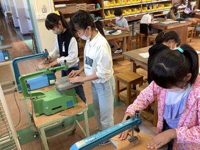 5年生の図工の学習では、今後、電動糸のこぎりを使った作品作りを行っていきます。練習板を使って、その使い方を練習している様子です。