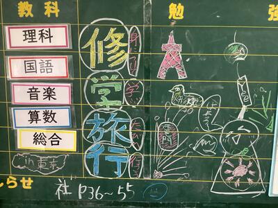 いよいよ、明日から6年生は修学旅行に出発します。5時間目は学年で最終確認を行っていました。教室や廊下の掲示等からも楽しみな気持ちが伝わってきます。5年生からの「いってらっしゃい」のメッセージもありました。